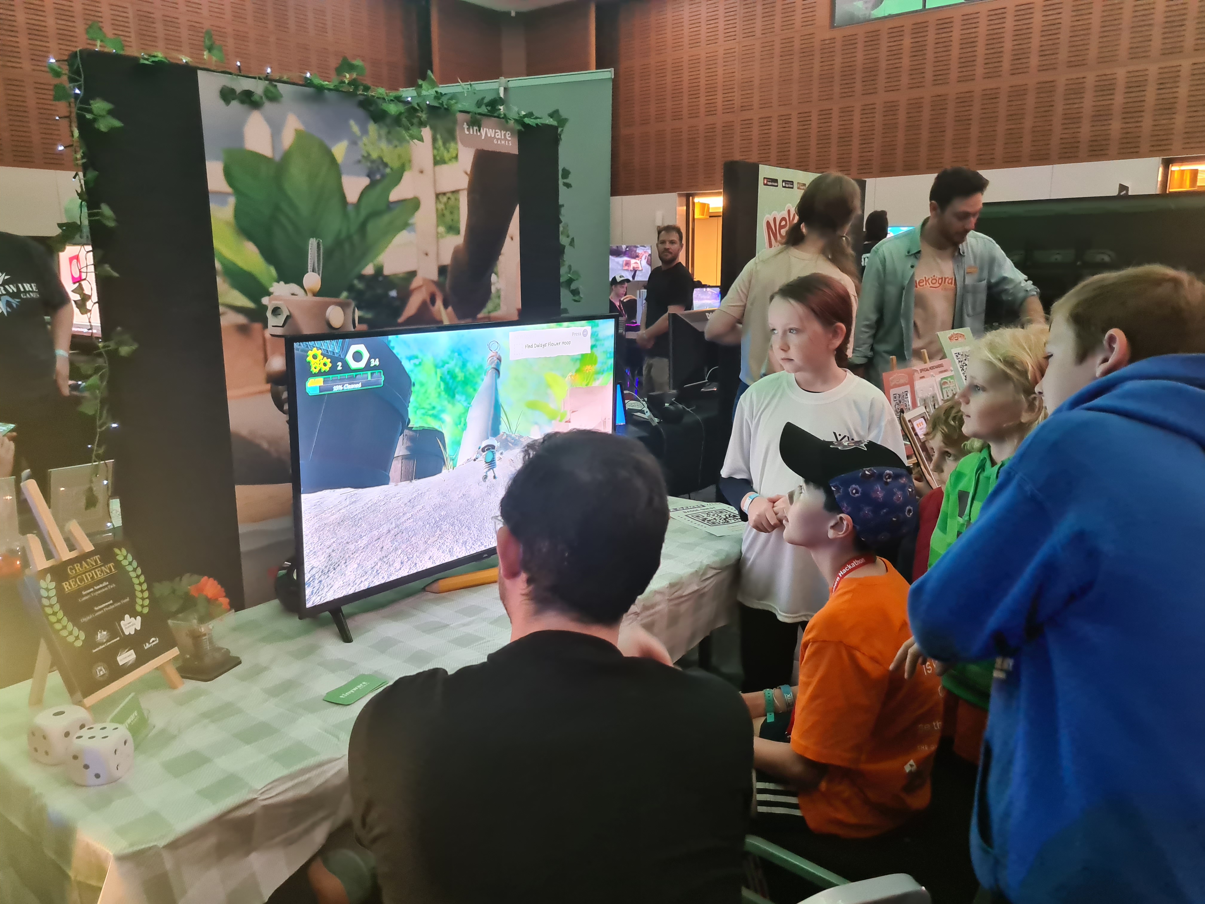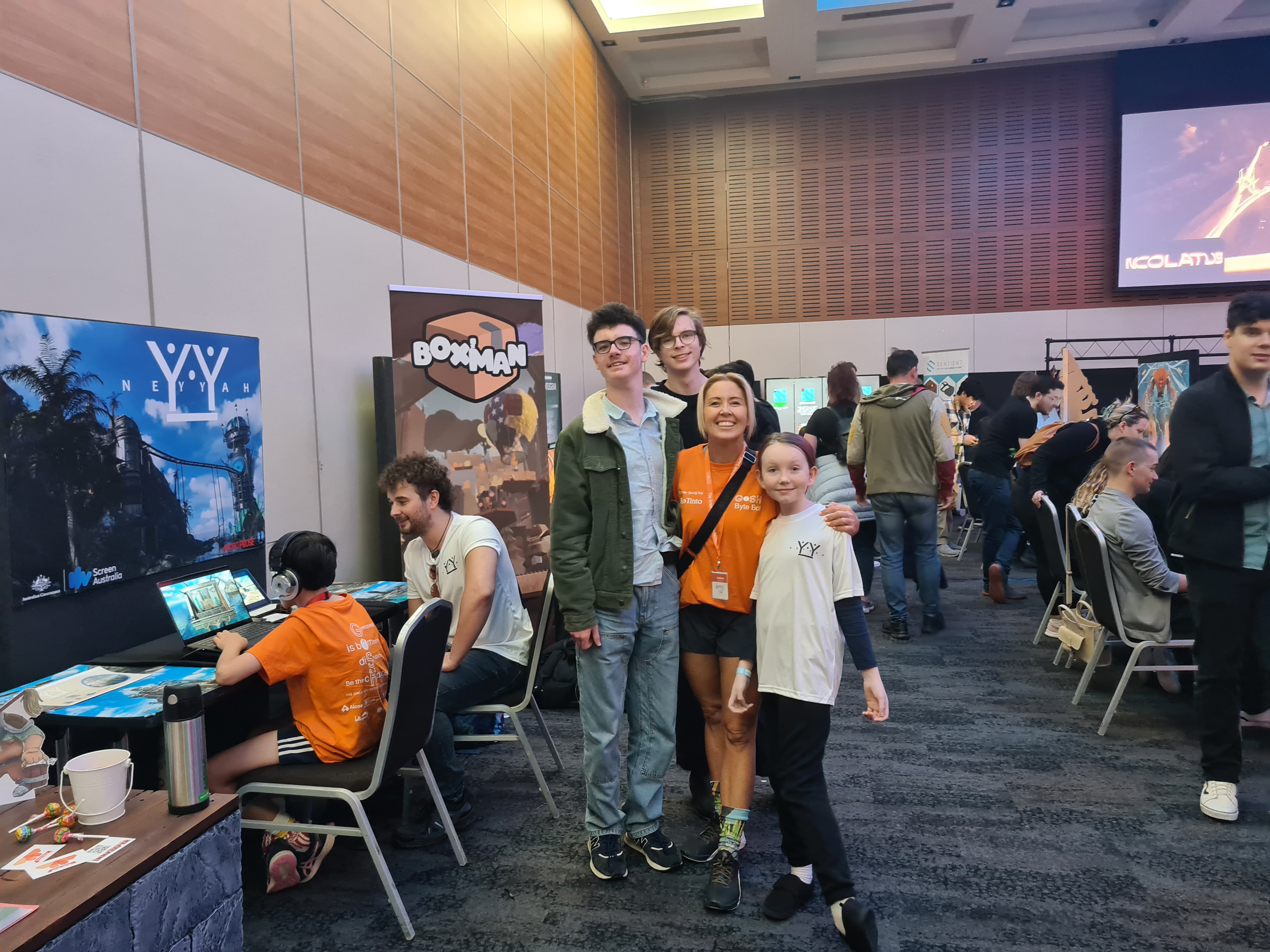 The Mandurah Coder Dojo Ninjas – accompanied by the lovely Michelle Wong – had an absolute ball playing demos and speaking to developers at Perth Games Festival! Some of the favourite games of the day were Arch Rebel’s Ghost Cam; Winterwire’s Power Sink; Echidna Studios’ Ricochet Rodeo; Studio Kraze’s Courier Tale; Tinyware Games’ Misc. A Tiny Tale; Funny Fintan Softworks’ Incolatus; Level126games’ Tether; Vivski Entertainment’s Fiasco at the Agency; and (of course!) Defy Reality Entertainment’s Neyyah… shameless self-plug alert!